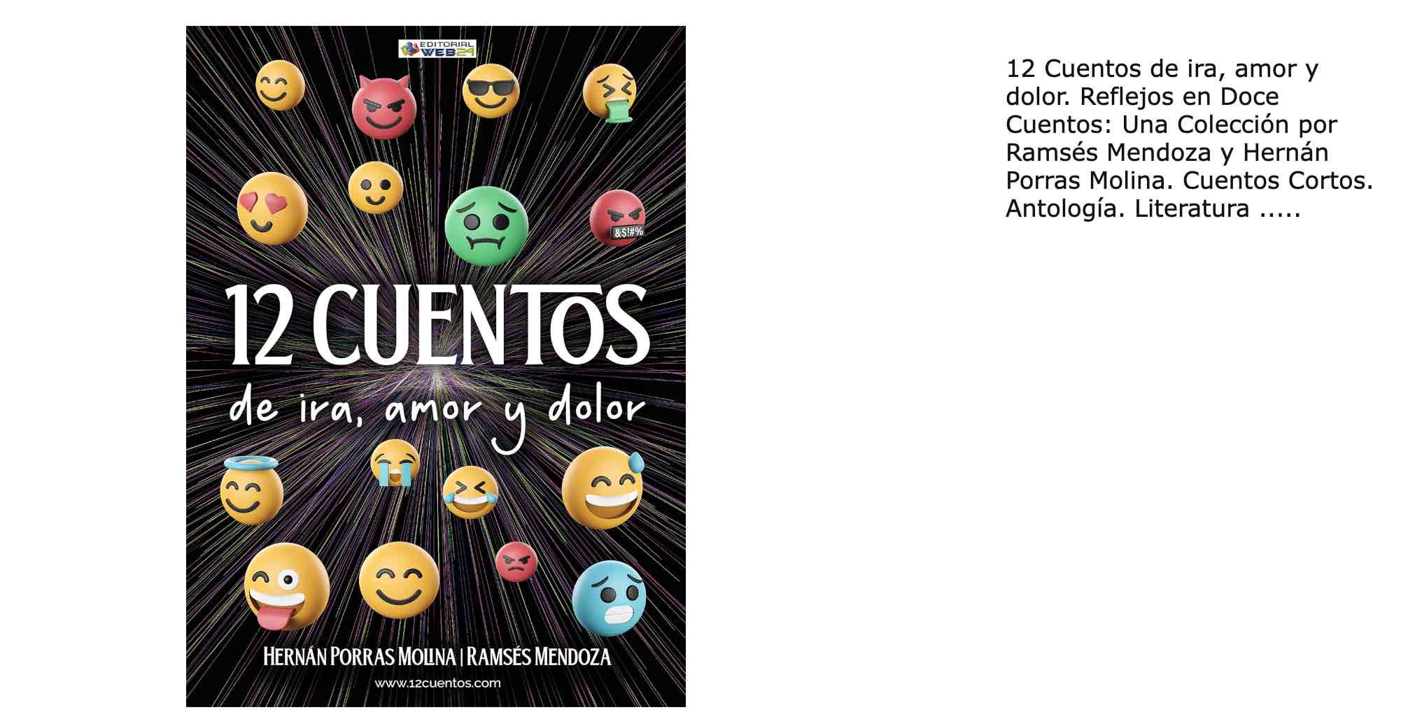 12 Cuentos de ira, amor y dolor” es una antología que se aleja de los convencionalismos narrativos para sumergir al lector en escenarios de alta carga emocional. Desde el relato más visceral hasta el más íntimo, cada cuento explora aspectos de la vida cotidiana, conflictos internos, traiciones, pasiones, pérdidas y esperanzas.